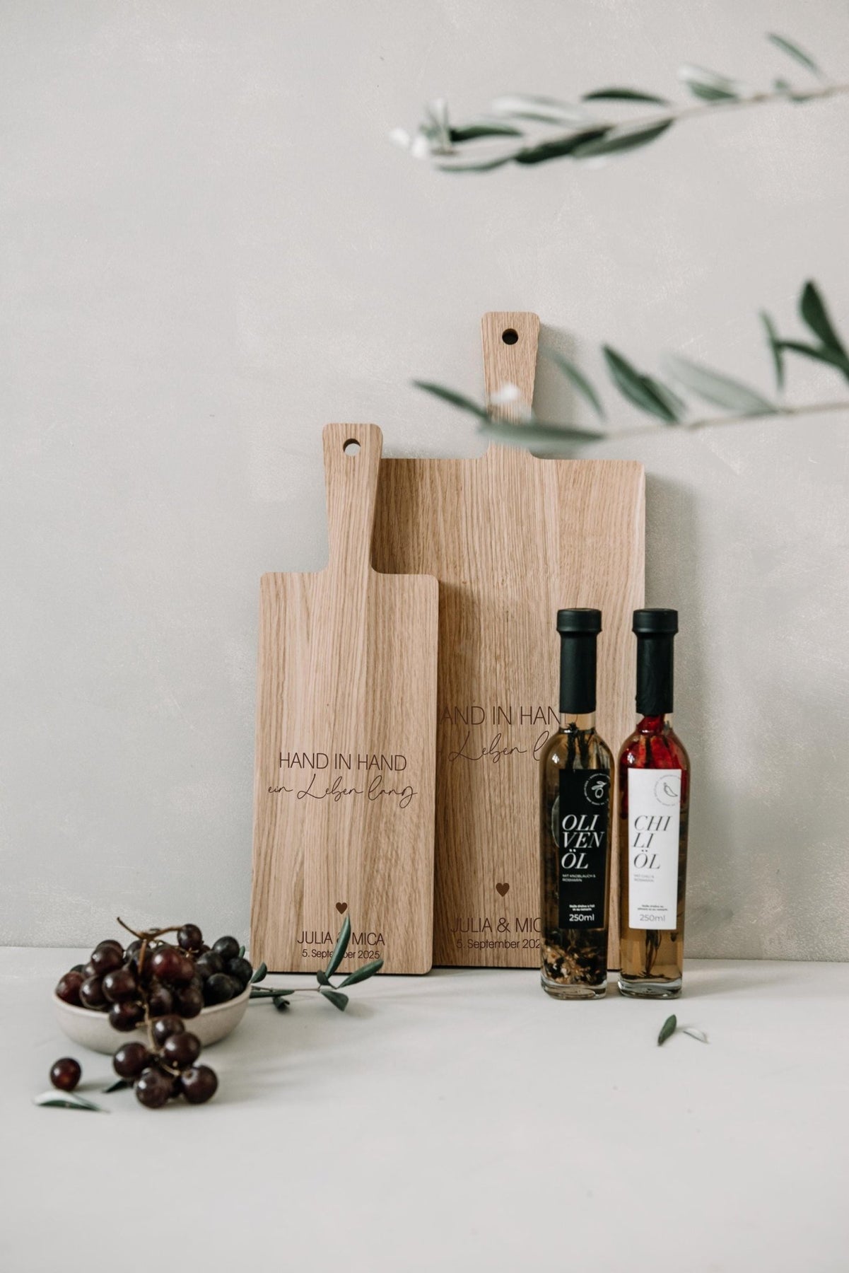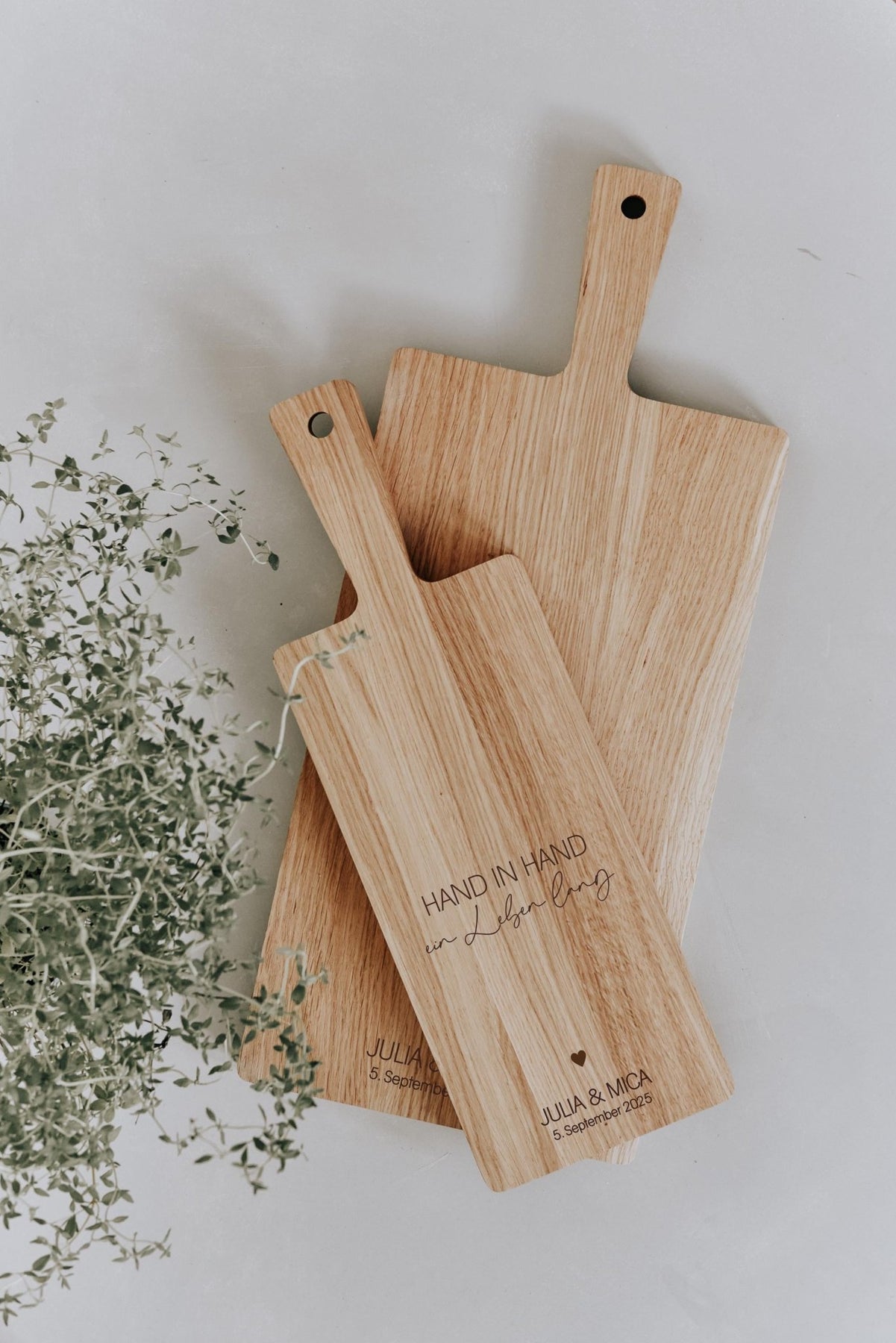 Schneidebrett personalisiert als Geschenk "Hand in Hand", Hochzeitsgeschenk oder zum Einzug für Freunde und Familie, Servierbrett aus Eiche