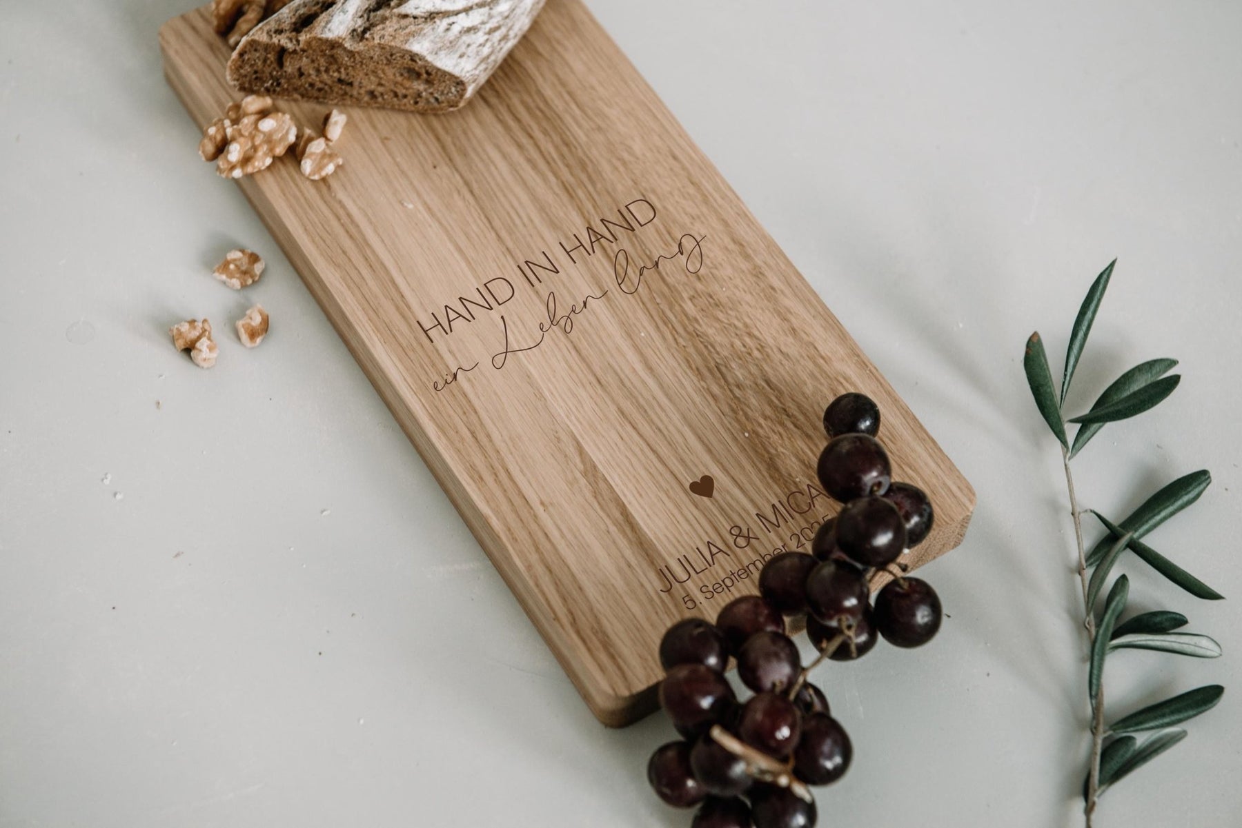 Schneidebrett personalisiert als Geschenk "Hand in Hand", Hochzeitsgeschenk oder zum Einzug für Freunde und Familie, Servierbrett aus Eiche - Jellies Design